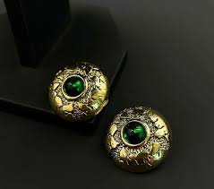 These exquisite emerald and gold earrings are said to be symbols of strength and fortune, worn by noble warriors and empresses of the past. The deep green gem, encased in intricate gold, represents wisdom and protection, a charm against misfortune.